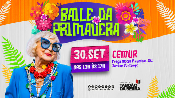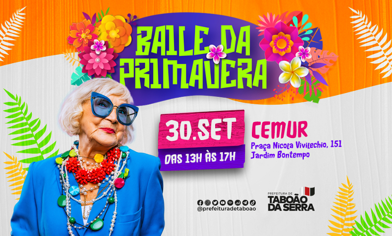 A Prefeitura de Taboão da Serra vai realizar na sexta-feira, 30/09, mais uma edição do Baile da Primavera da Melhor Idade, com entrada gratuita, no CEMUR, das 13 às 17 horas, na Praça Nicola Vivilechio, 151, no Jardim Bontempo.