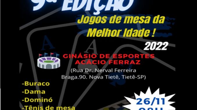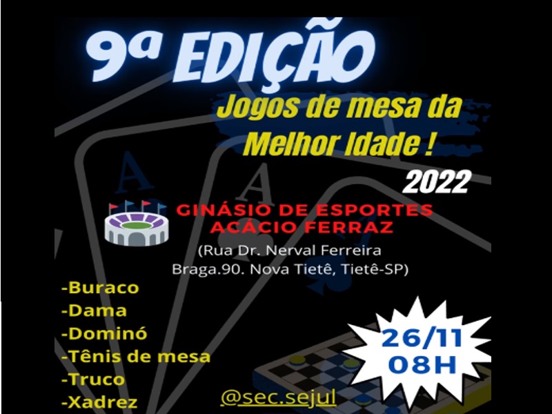 A cidade de Tietê, no Interior de SP, distante 121 km da Capital, realizou no último sábado, 26 de novembro, a 9ª edição dos Jogos de Mesa da Melhor Idade, promovida pela sua Secretaria Municipal de Esportes Lazer e Juventude, no Ginásio Acácio Ferraz.