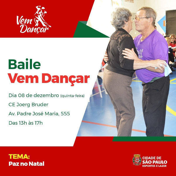 O programa Vem Dançar, da Secretaria Municipal de Esportes de São Paulo, vai realizar na tarde da quinta-feira, 8 de dezembro, das 13 às 17 horas, um baile gratuito, aberto para todas as pessoas interessadas.