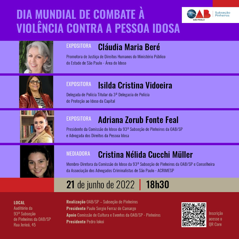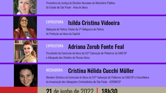 Farão parte da mesa de debates: a Promotora de Justiça do MPSP, Claudia Beré; a delegada da Delegacia de Proteção ao Idoso de Perdizes, Isilda Cristina Vidoeira, a advogada Adriana Zorub Fonte Feal, presidente da Comissão da Pessoa Idosa de Pinheiros e a advogada Cristina Nélida Cucchi Müller, da Associação dos Advogados Criminalistas de SP.