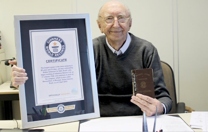 Walter Orthmann com a placa do Guinness Records, por ser o funcionário mais antigo do mundo numa única empresa. Foto: reprodução Youtube